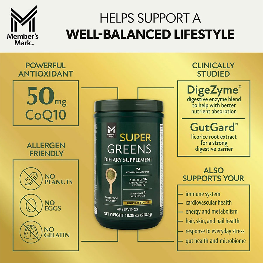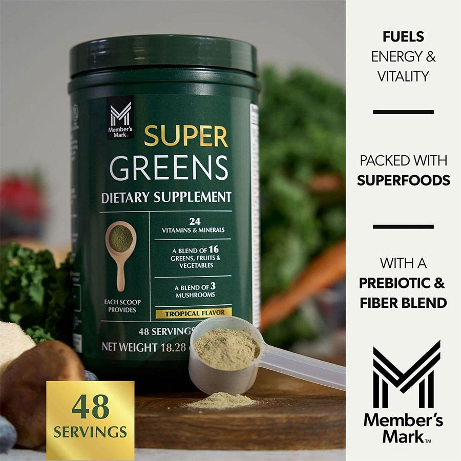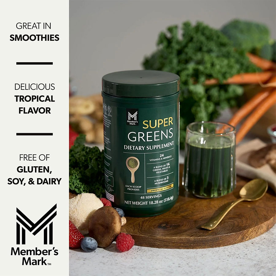 Tăng cường dinh dưỡng hàng ngày của bạn với Member’s Mark™ Super Greens, một hỗn hợp mạnh mẽ được thiết kế để hỗ trợ năng lượng, quá trình trao đổi chất và sức sống tổng thể.* Mỗi muỗng chứa 24 loại vitamin và khoáng chất thiết yếu, bao gồm 1.110% lượng biotin cần thiết hàng ngày để giúp duy trì mái tóc, làn da và móng khỏe mạnh, và 136% lượng kẽm cần thiết hàng ngày để hỗ trợ sức khỏe miễn dịch.*