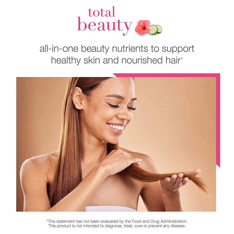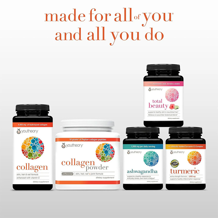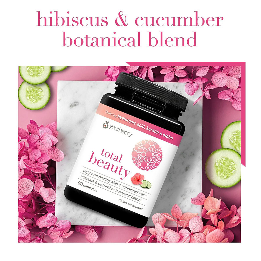 Youtheory® Total Beauty là thực phẩm bổ sung làm đẹp toàn diện, bao gồm một số dưỡng chất hiệu quả và đang thịnh hành nhất cho làn da, móng tay khỏe mạnh và mái tóc được nuôi dưỡng. Hỗn hợp thảo dược hoa dâm bụt và dưa chuột kết hợp với 250mg collagen peptide, 300mcg biotin và các thành phần được nghiên cứu lâm sàng — 500mg Cynatine® keratin và 120mg Hyabest® hyaluronic acid hỗ trợ vẻ đẹp từ bên trong. Với dạng viên nang tiện lợi, các dưỡng chất này giúp tăng cường độ ẩm cho da và cải thiện độ ẩm, cải thiện độ sáng và vẻ ngoài tổng thể của da — đồng thời hỗ trợ mái tóc chắc khỏe, được nuôi dưỡng tốt hơn, tăng độ bóng mượt cho tóc và giảm rụng tóc.*