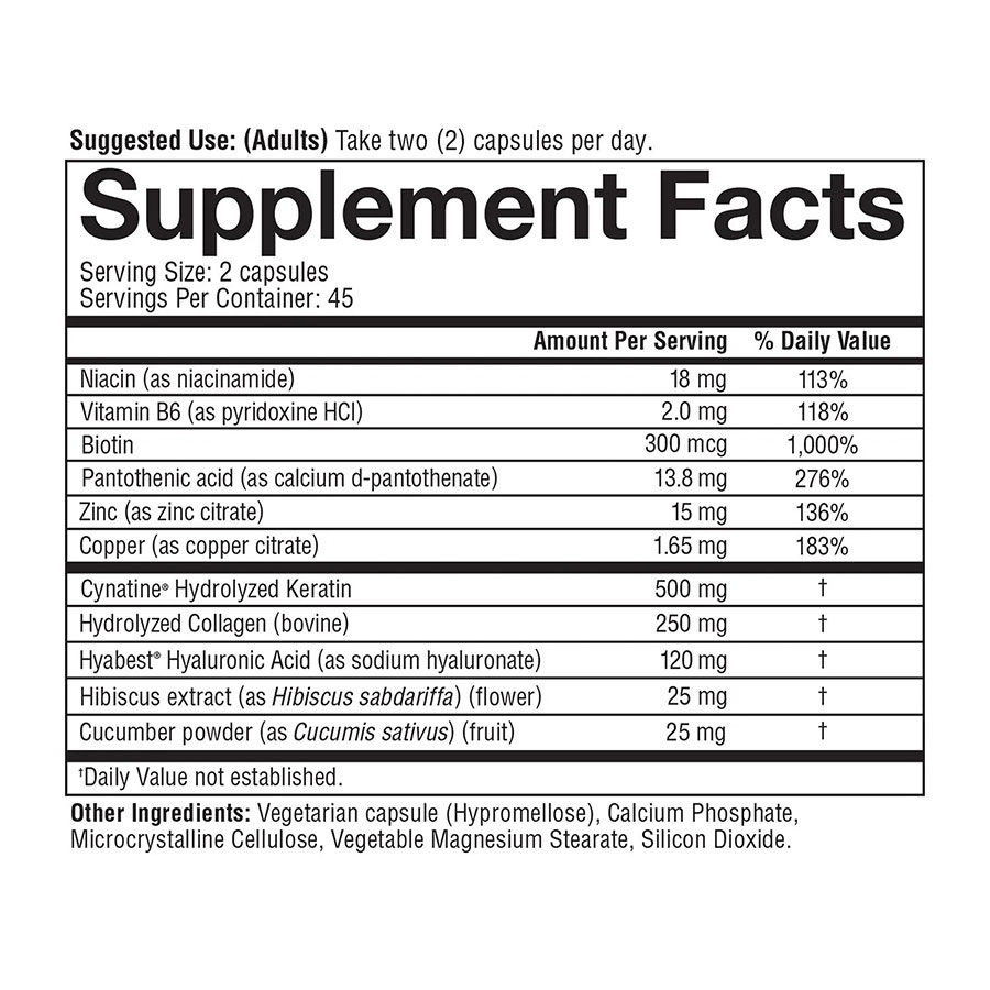 Collagen peptide thủy phân giúp chống lại sự mất collagen do tuổi tác. Biotin là một dưỡng chất thiết yếu cho sắc đẹp, được đánh giá cao nhờ những lợi ích về sắc đẹp và hứa hẹn mang lại nhiều lợi ích cho sức khỏe tóc và móng.*