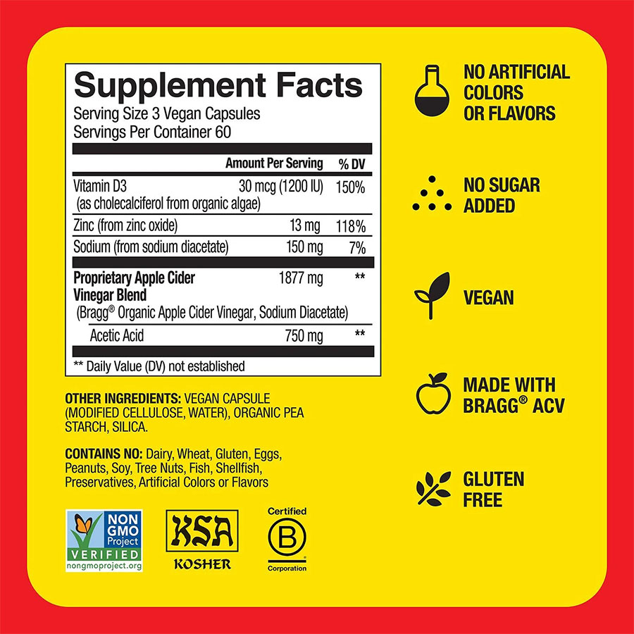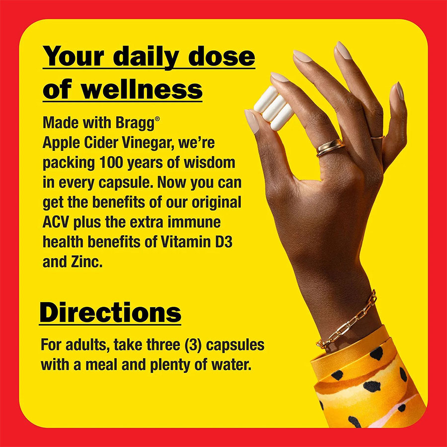 Giờ đây, bạn có thể sở hữu Giấm táo hữu cơ Bragg với Vitamin D và Kẽm cho hệ miễn dịch. Viên uống Giấm táo Bragg sử dụng giấm táo Bragg lên men tự nhiên của chúng tôi và chuyển hóa thành dạng viên nang, tạo nên sản phẩm duy nhất cung cấp cùng hàm lượng 750 mg axit axetic mỗi khẩu phần như giấm táo nguyên bản – không thêm đường như hầu hết các loại kẹo dẻo giấm táo khác.** Sản phẩm bổ sung giấm táo này không biến đổi gen, đạt chuẩn kosher, thuần chay, không chứa gluten và không chứa hương liệu, màu nhân tạo hay đường bổ sung. Chúng tôi kết hợp các thành phần thiết yếu giúp tăng cường sức khỏe cho từng loại thực phẩm bổ sung giấm táo của chúng tôi. Mang theo giấm táo Bragg mọi lúc, mọi nơi với Viên uống bổ sung giấm táo Bragg.