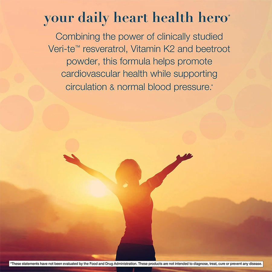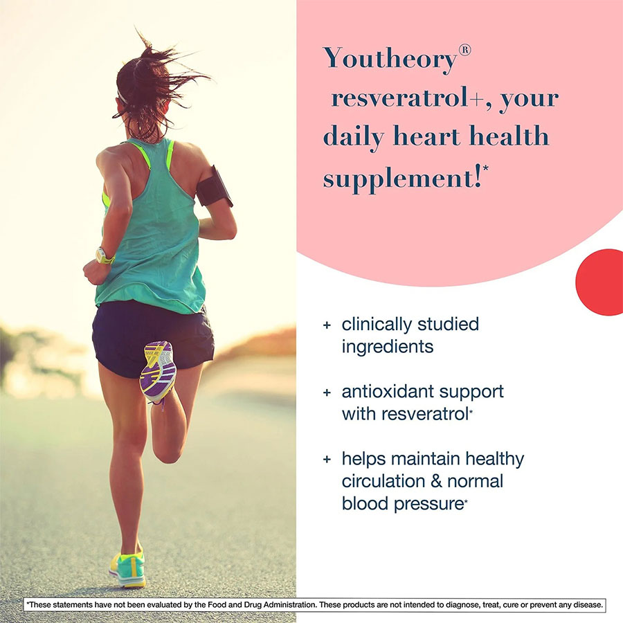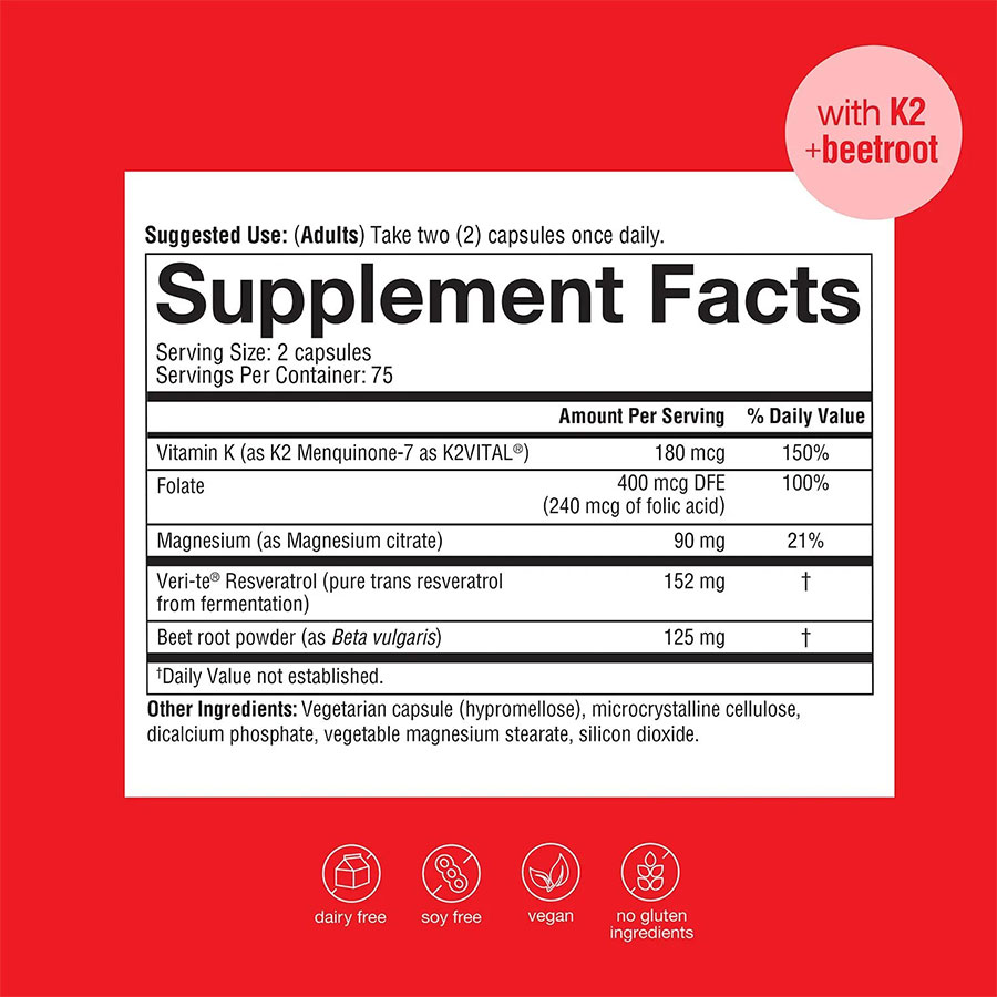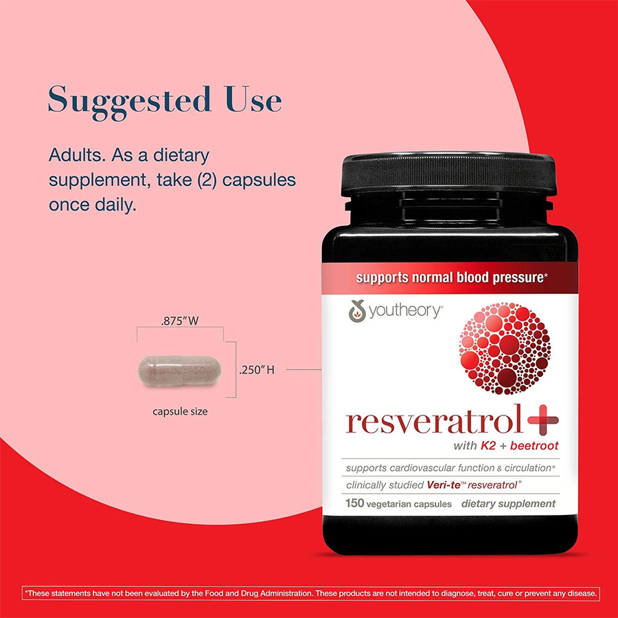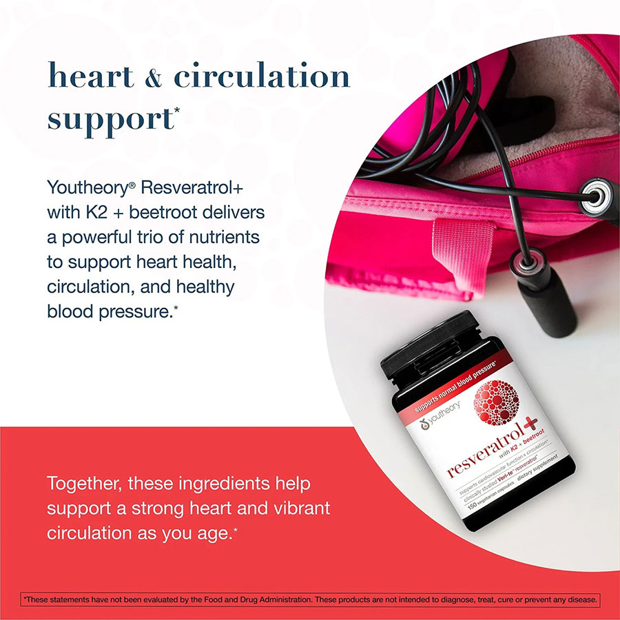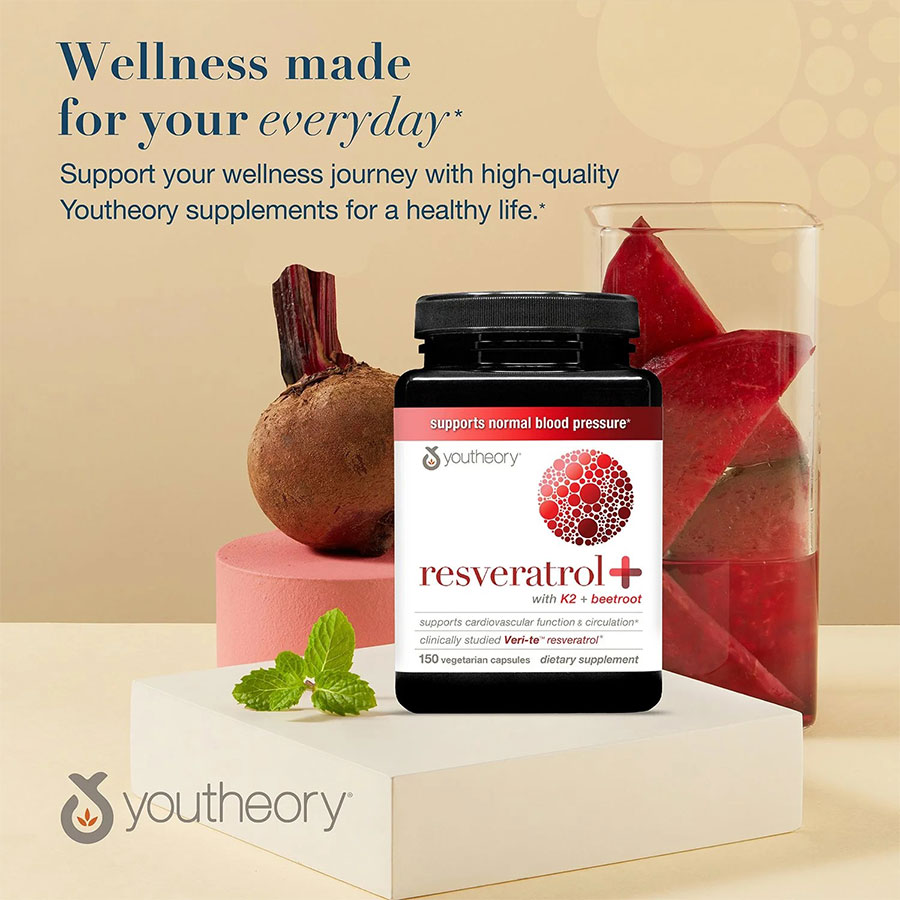 Thực phẩm bổ sung Youtheory® Resveratrol+ với K2+ từ củ dền kết hợp sức mạnh của Veri-te® Resveratrol, Vitamin K2 và củ dền. Công thức tốt cho tim mạch này giúp tăng cường sức khỏe tim mạch, hỗ trợ tuần hoàn máu và huyết áp bình thường – giúp bạn tươi trẻ và duy trì sức khỏe tổng thể. Được chứng minh bằng khoa học và được thiết kế để mang lại kết quả, resveratrol+ chính là người hùng sức khỏe tim mạch hàng ngày của bạn.*
