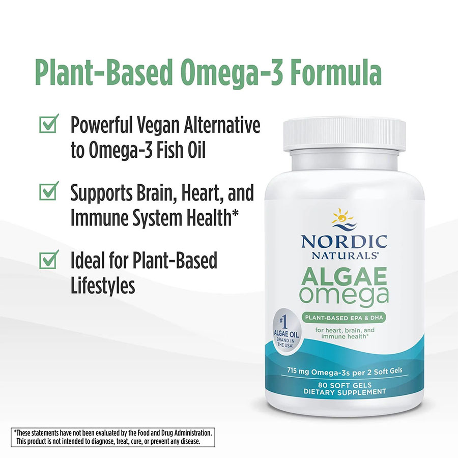 Algae Omega cung cấp nguồn EPA và DHA bền vững, thân thiện với người ăn chay, cung cấp 715 mg omega-3 chỉ trong hai viên nang mềm thực vật. Dầu tảo được chiết xuất từ schizochytrium sp., một loại vi tảo biển độc đáo tự nhiên sản sinh EPA và DHA. Điều này khiến Algae Omega trở thành một chất bổ sung thiết yếu cho những người ăn chay, vốn có thể không cung cấp đủ lượng dưỡng chất quan trọng này.